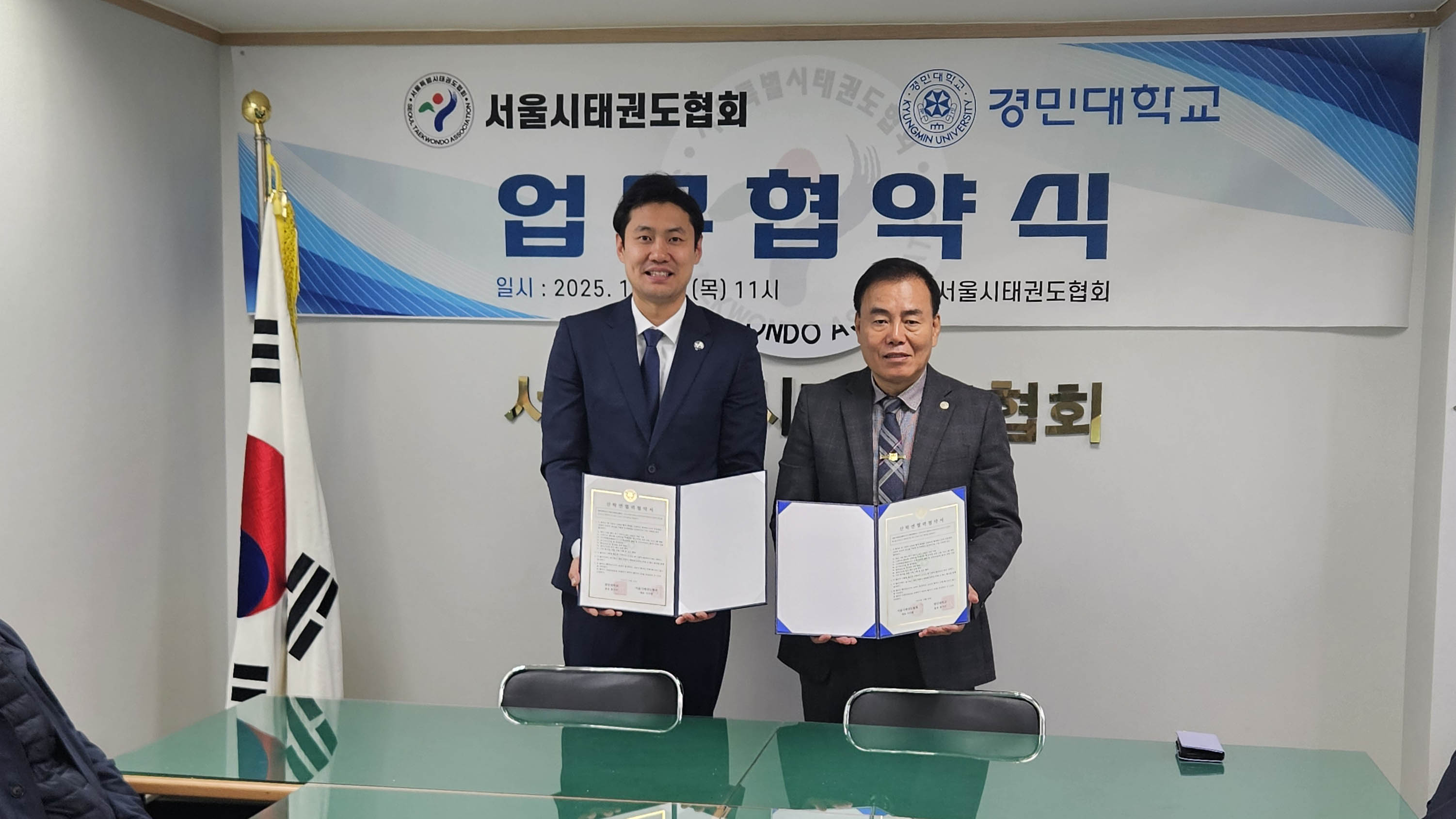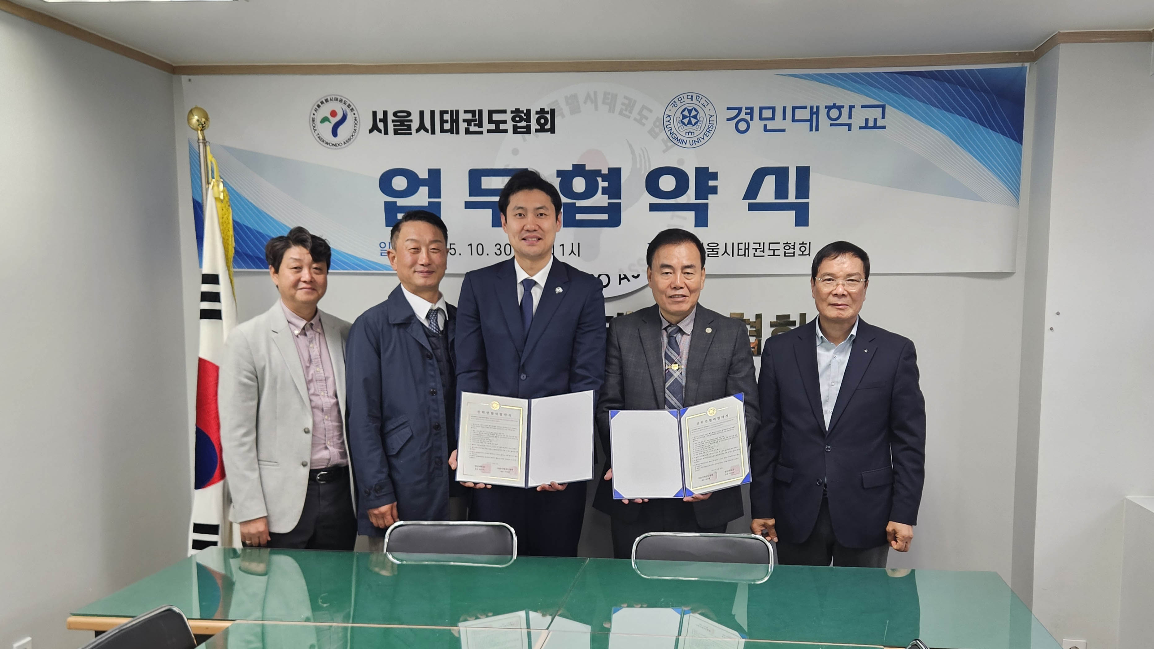 ○ 경민대학교 태권도외교과는 지난 2025년 10월 30일(목) 서울시태권도협회와 업무협약을 체결했다. 이번 협약식에는 서울시태권도협회 이자형 회장과 경민대학교 태권도외교과 이진형 교수를 비롯해 양 기관 관계자들이 참석해 자리를 함께했다