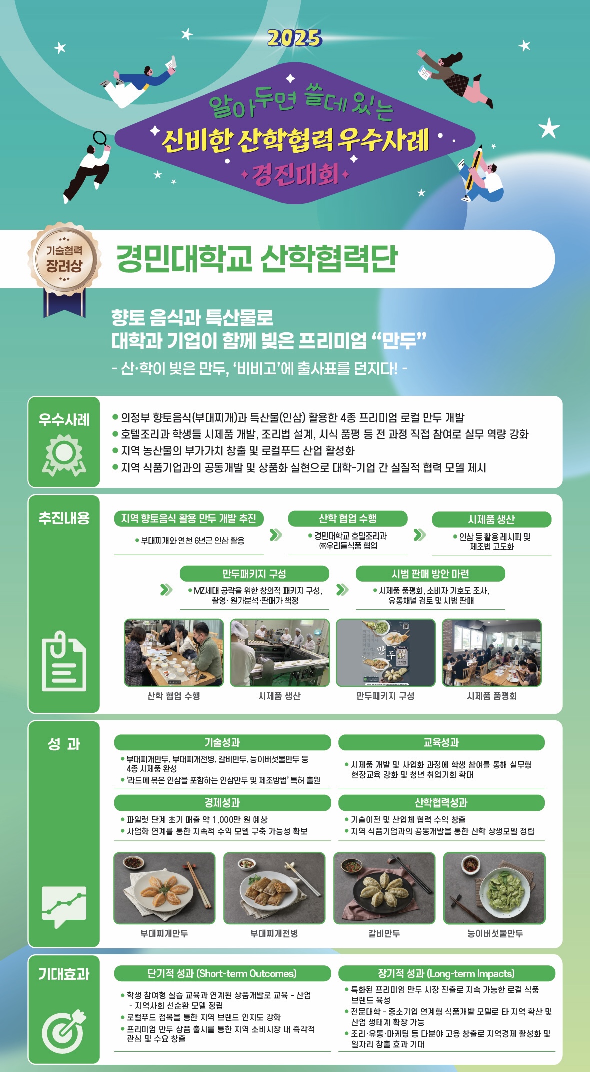 이번 프로젝트는 의정부의 대표 음식인 부대찌개와 지역 특산물 인삼을 접목하여 ▲부대찌개만두 ▲부대찌개전병 ▲갈비만두 ▲능이버섯물만두 등 4종의 프리미엄 시제품을 완성한 성과로 주목받았다.
