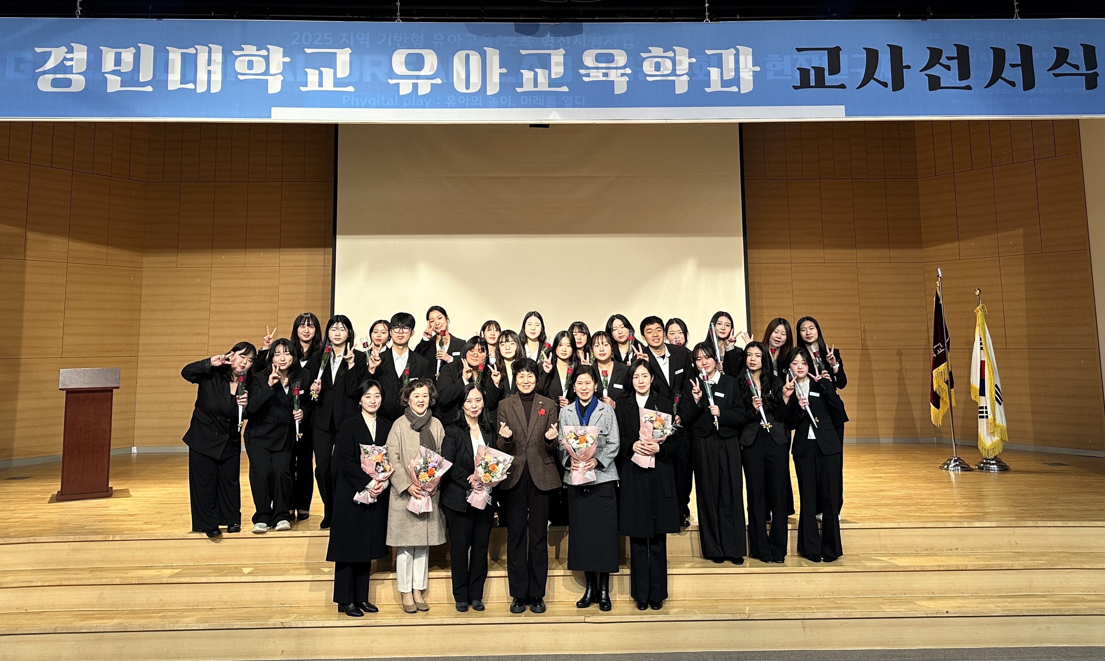 〇 이날 행사에는 홍지연, 박해미, 우민정, 홍지희, 신미영, 김혜경 교수가 참석해 학생들을 격려하며, 따뜻한 응원의 메시지와 함께 예비교사로서의 책임과 소명을 강조하였다. 학생들은 선서식을 통해 유아교사로서의 첫 마음을 되새기고, 아이들의 성장을 책임지는 교육 전문가로 성장할 것을 다짐했다.